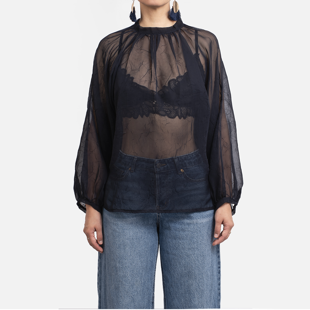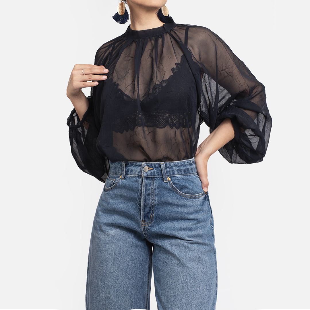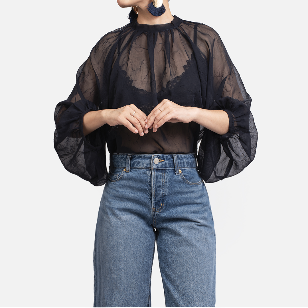 Un blusón de gasa transparente con textura que aporta elegancia sin esfuerzo. Su cuello halter suave, junto a las mangas globo ligeras, crean una silueta moderna y femenina.