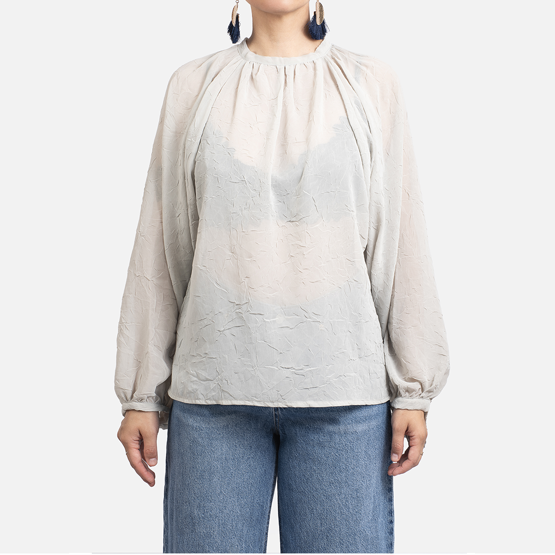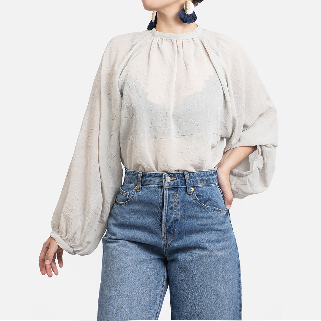 Un blusón de gasa transparente con textura que aporta elegancia sin esfuerzo. Su cuello halter suave, junto a las mangas globo ligeras, crean una silueta moderna y femenina.