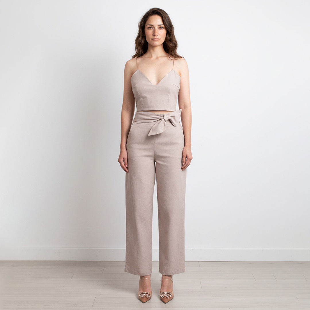 El Pantalón Bozzanova aporta versatilidad, de tiro alto, corte recto y un moño fijo en la cintura que estiliza la figura.