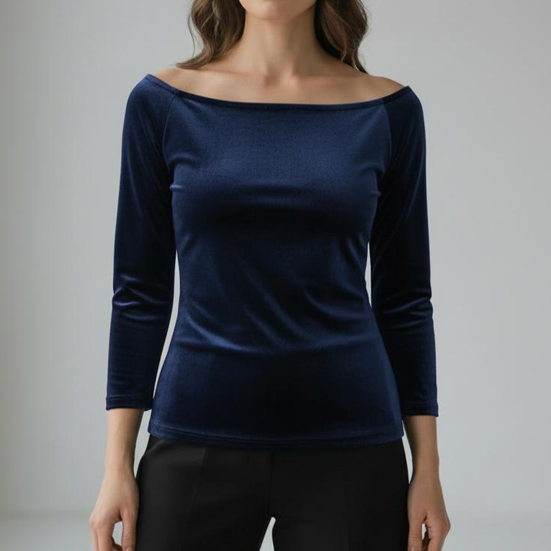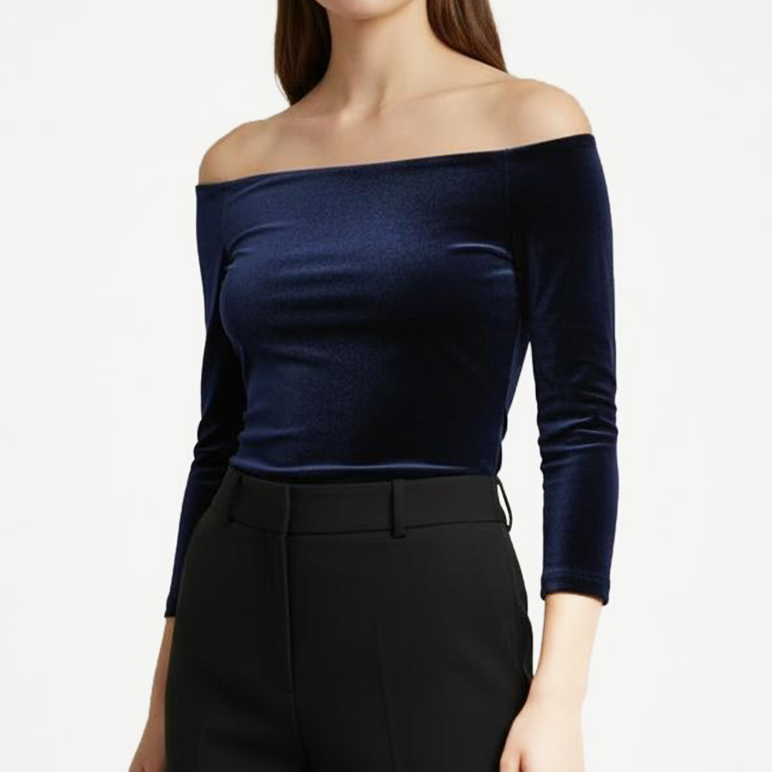 Este elegante y versátil top con hombros descubiertos está hecho en un terciopelo elasticado muy suave y cómodo.