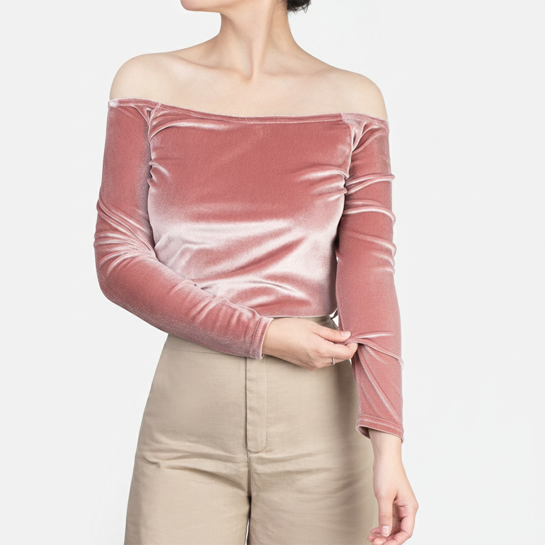 Este elegante y versátil top con hombros descubiertos está hecho en un terciopelo elasticado muy suave y cómodo.