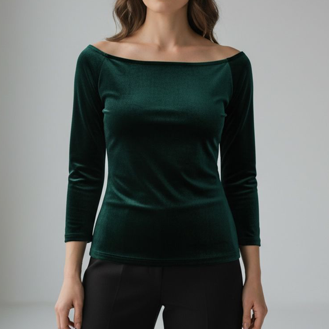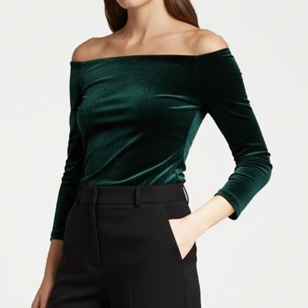 Este elegante y versátil top con hombros descubiertos está hecho en un terciopelo elasticado muy suave y cómodo.