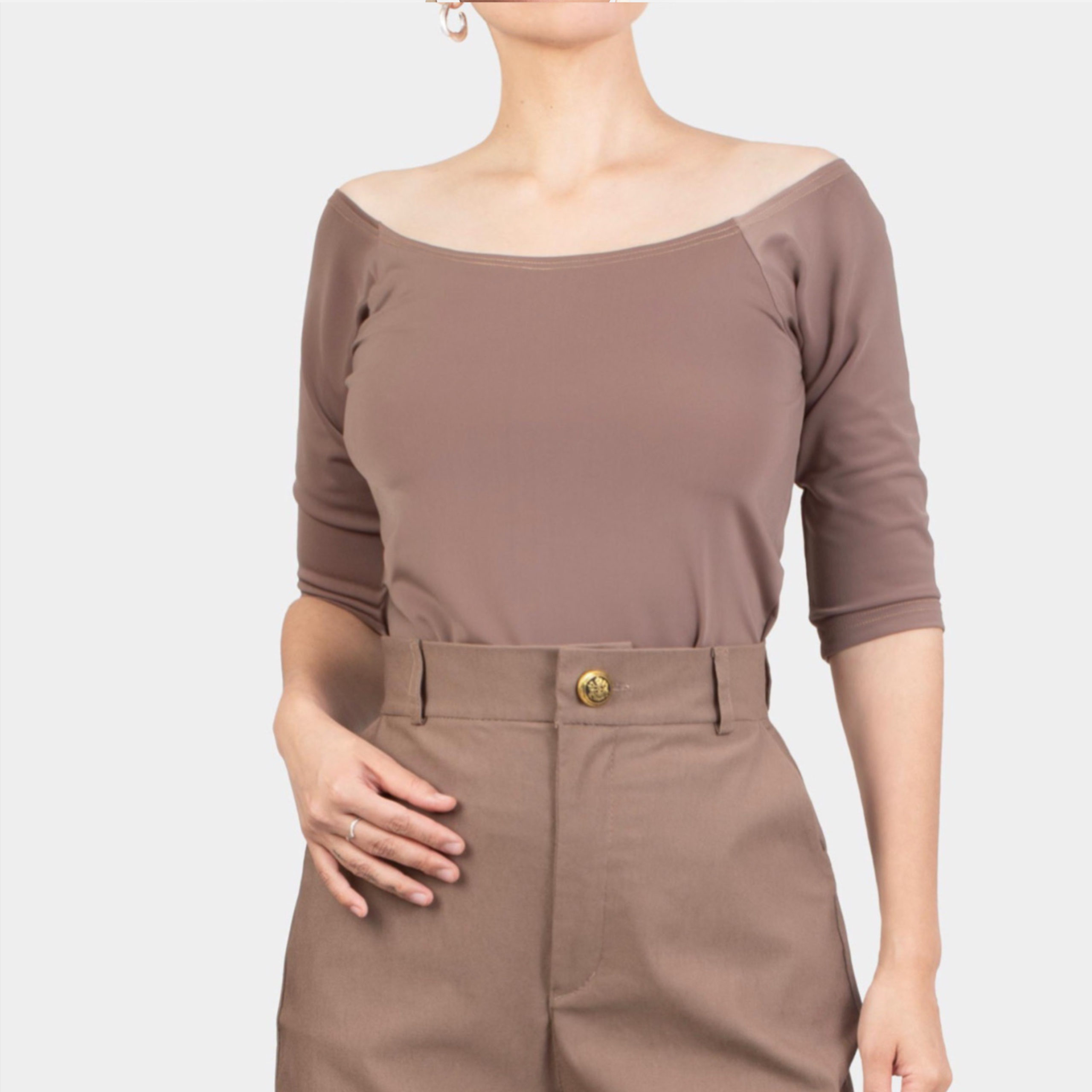 Este elegante y versátil top con hombros descubiertos de mangas 3/4, está hecho en una elastizada tela muy suave y cómoda.