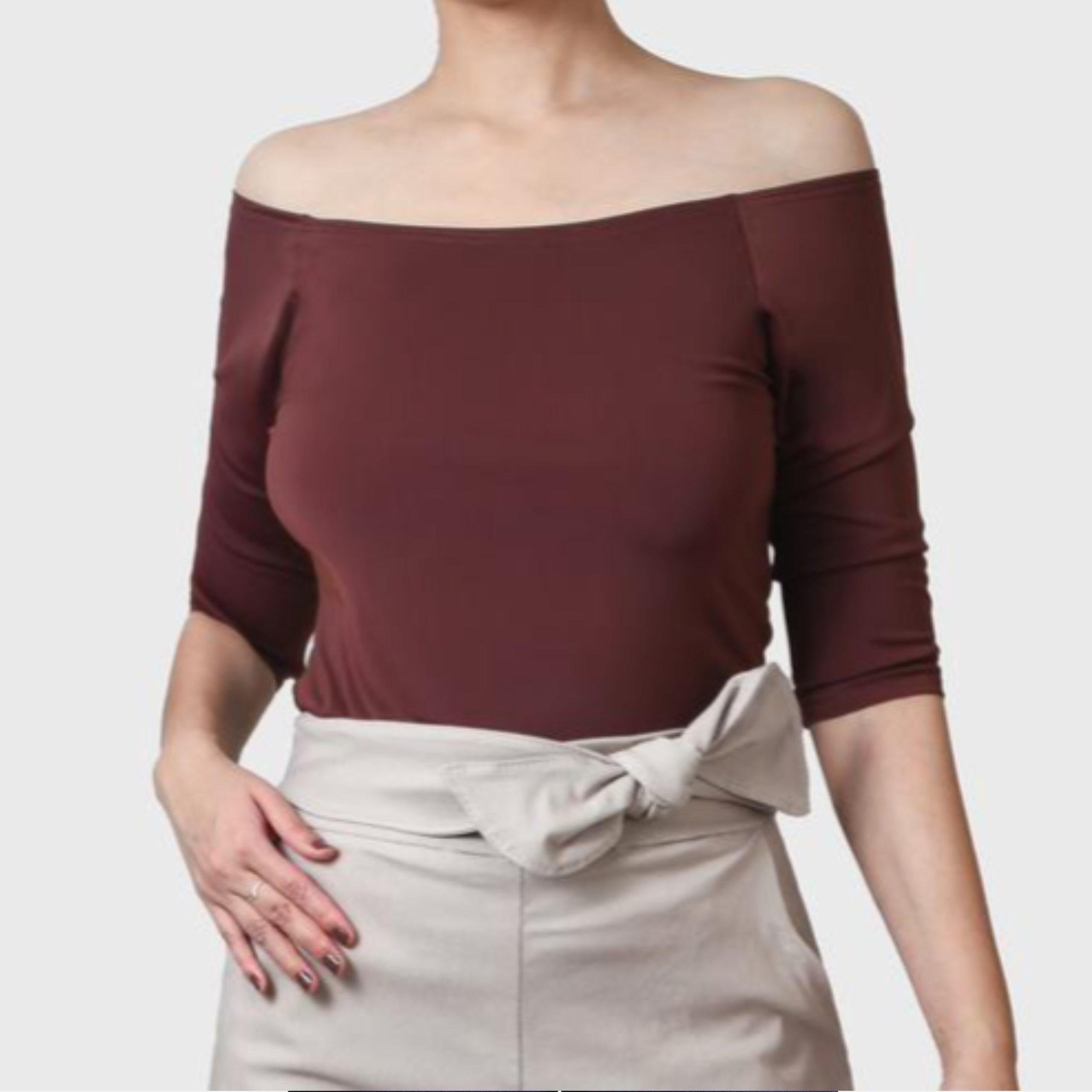 Este elegante y versátil top con hombros descubiertos de mangas 3/4, está hecho en una elastizada tela muy suave y cómoda.