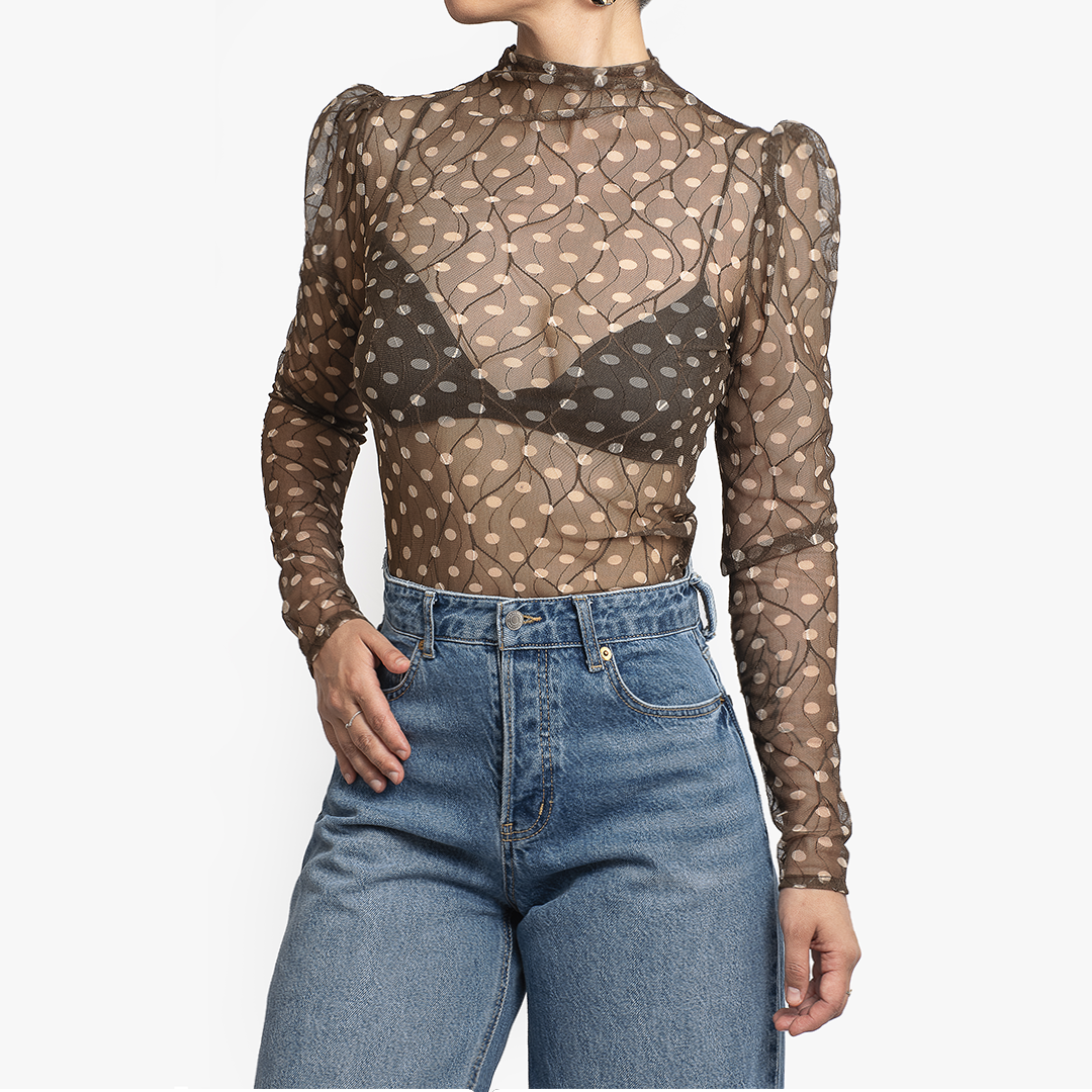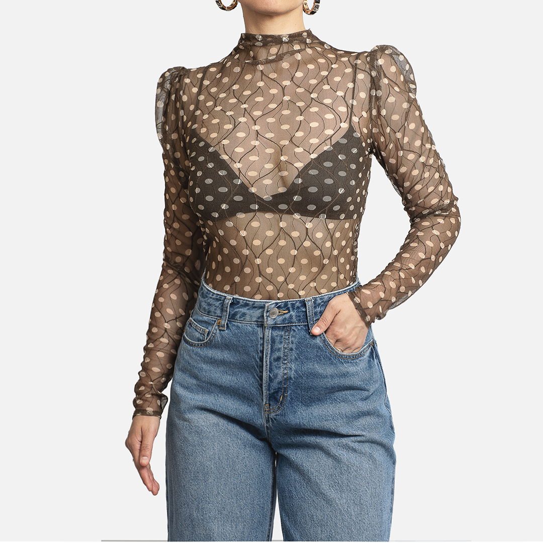 Su base nude translúcida crea un juego delicado con la piel, mientras el patrón de puntos negros con su suave manga abombada en el hombro aporta estructura visual y encanto.
