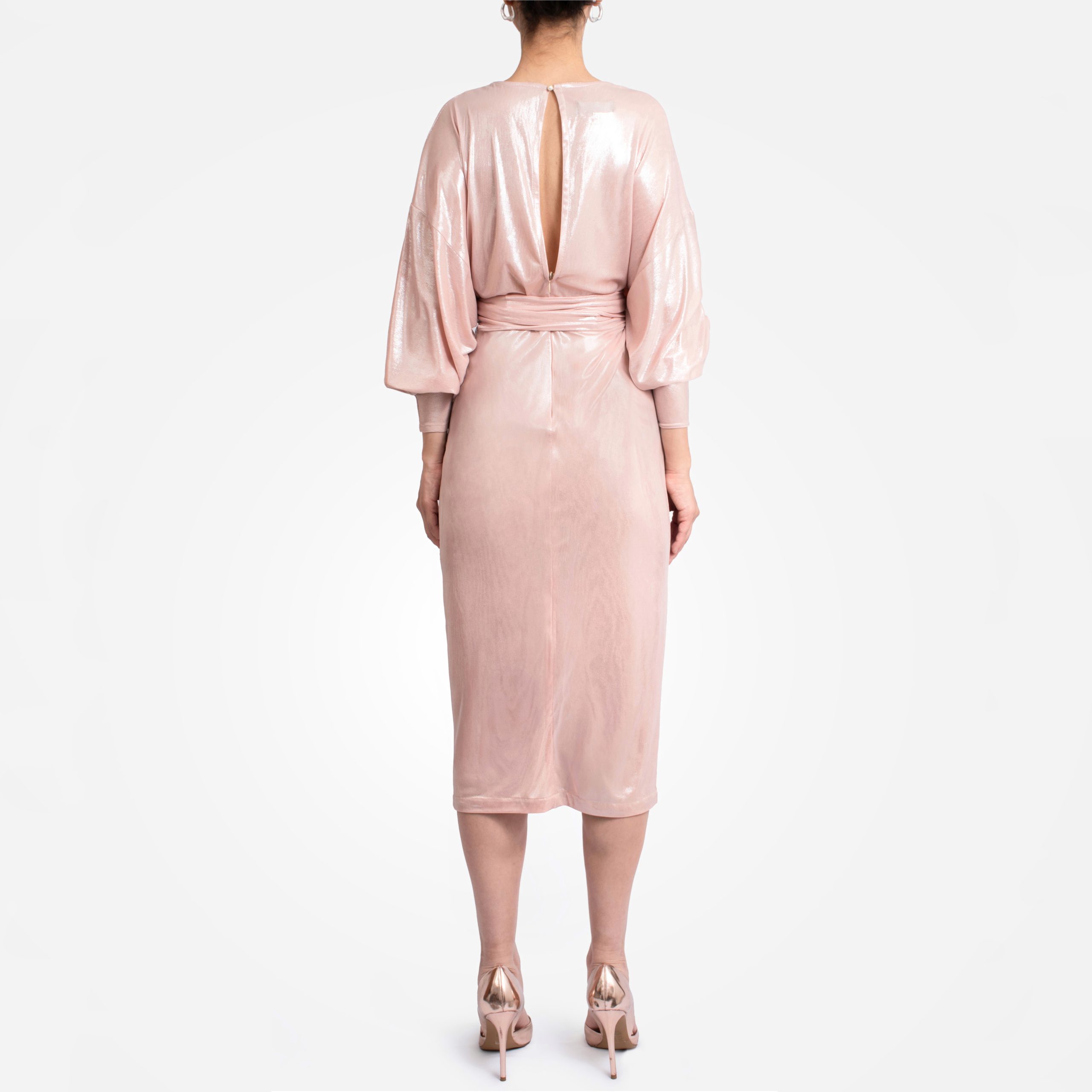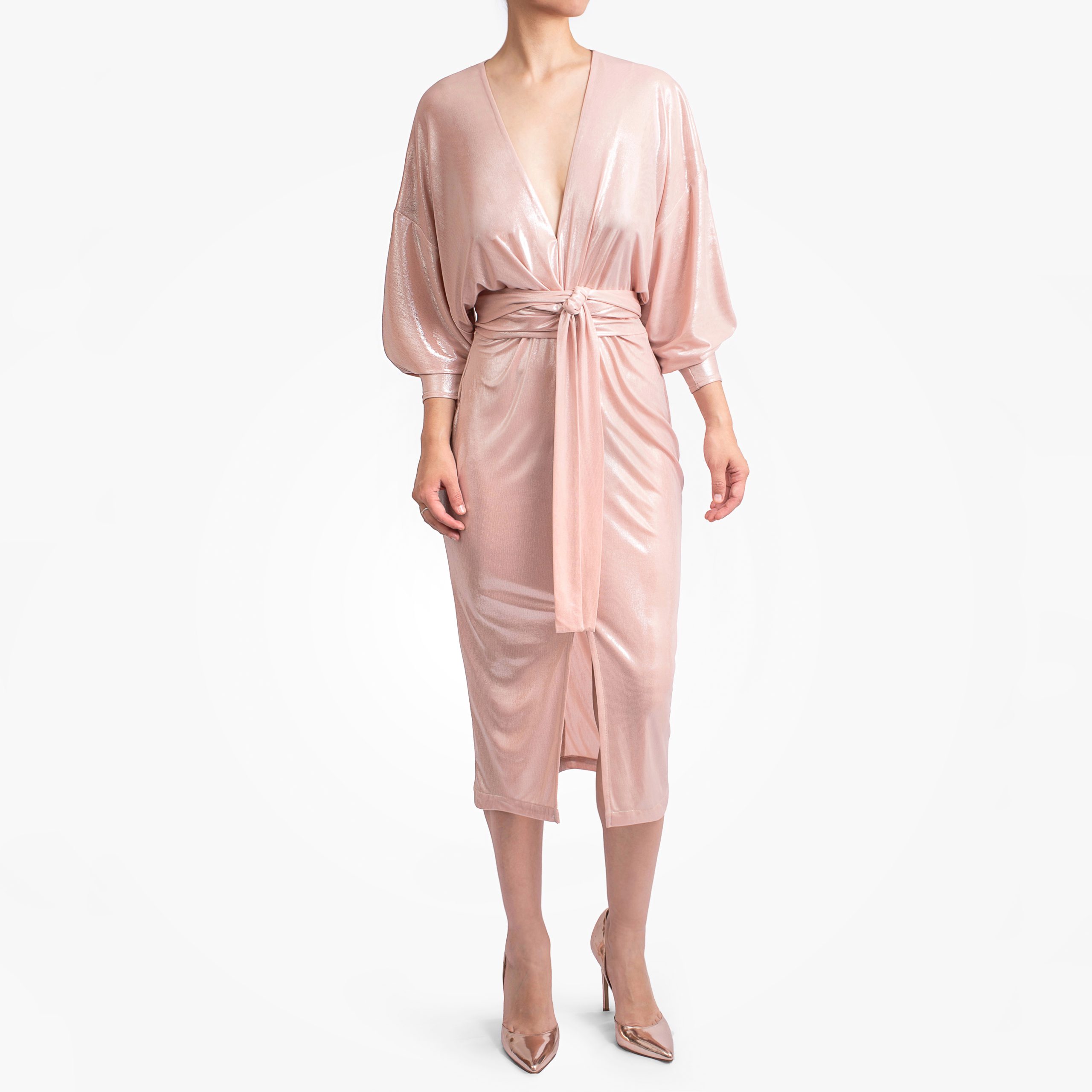 Combínalo con tacones metálicos, accesorios minimalistas o un peinado suave. Este vestido hace el resto: te envuelve, te estiliza y deja que brilles sin esfuerzo.