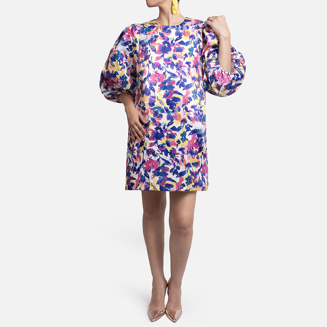 Este hermoso vestido es un modelo estándar, hecho en un satén con cuerpo que le otorga peso y soporte a su hermosa manga globo, tiene bolsillos y es especial para una tarde de coctel, un matrimonio de medio día o tarde noche, pero también para ir a trabajar y darle un poquito de color a tu día.