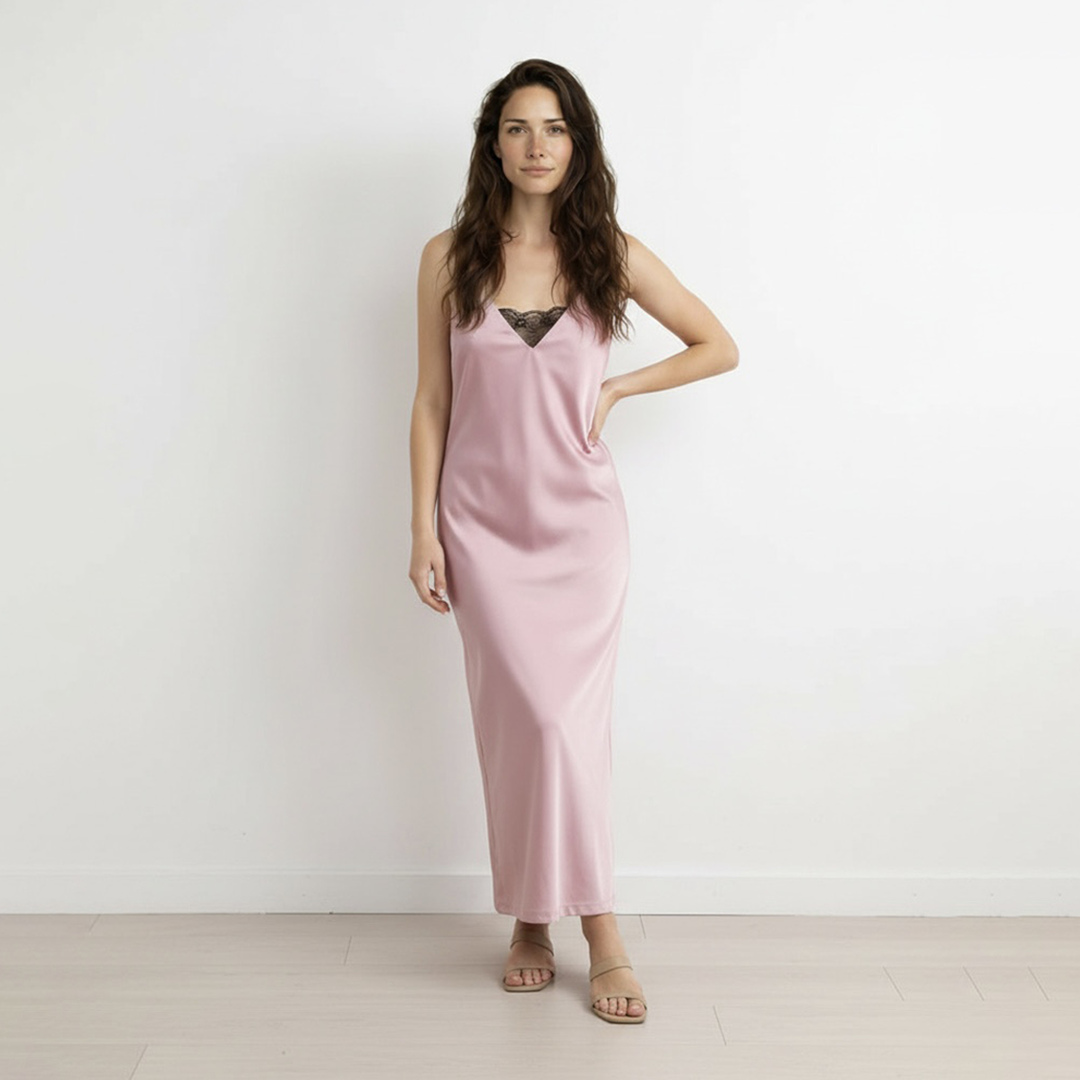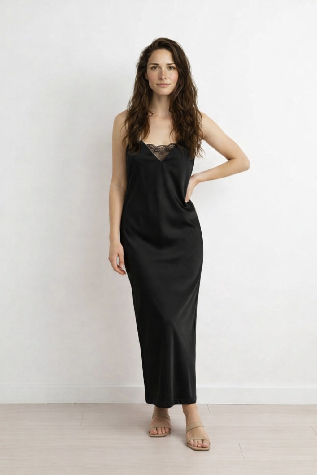 Vestido de satín de caída recta, confeccionado en tela suave y fluida que aporta una silueta limpia y elegante.