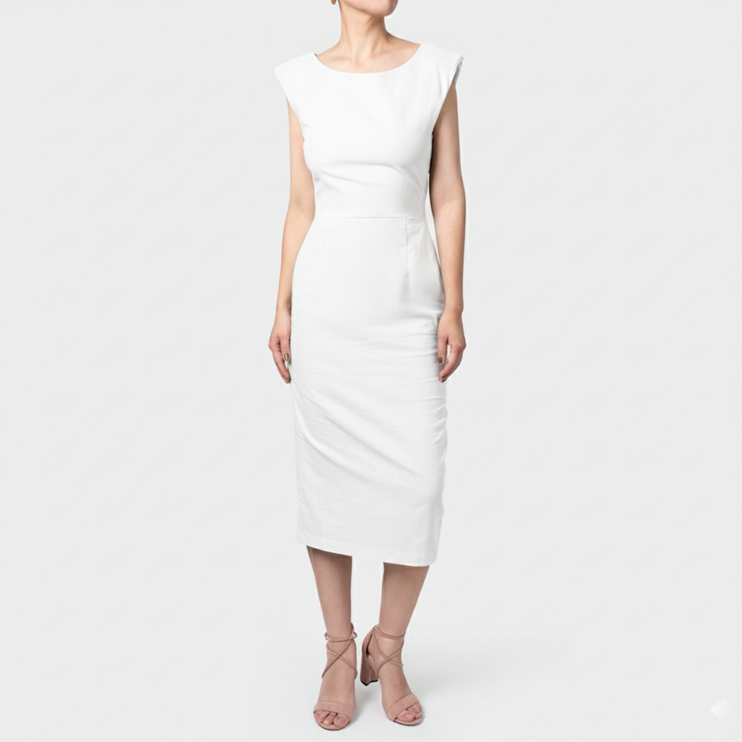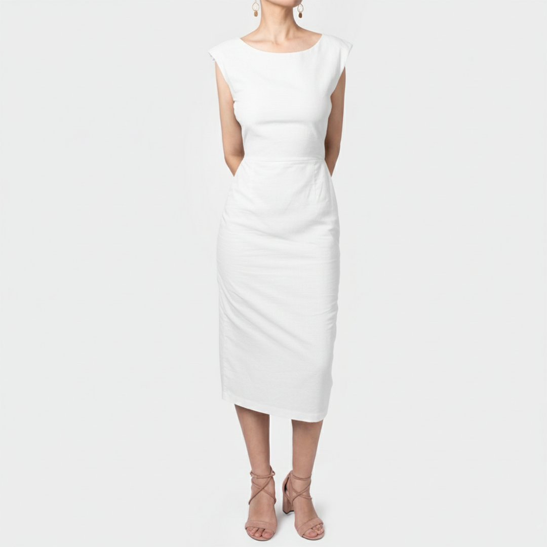 Este hermoso y distinguido vestido tubo midi 100% lino, forrado en lino; con falda y talle parcialmente forrados, hombreras sutiles y cierre lateral invisible, está diseñado para adaptarse al cuerpo con precisión, aportando estructura, equilibrio y una silueta limpia, fresca, femenina y elegante.