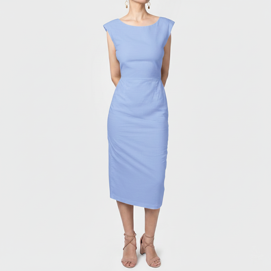 Este hermoso y distinguido vestido tubo midi 100% lino, forrado en lino; con falda y talle parcialmente forrados, hombreras sutiles y cierre lateral invisible, está diseñado para adaptarse al cuerpo con precisión, aportando estructura, equilibrio y una silueta limpia, fresca, femenina y elegante.