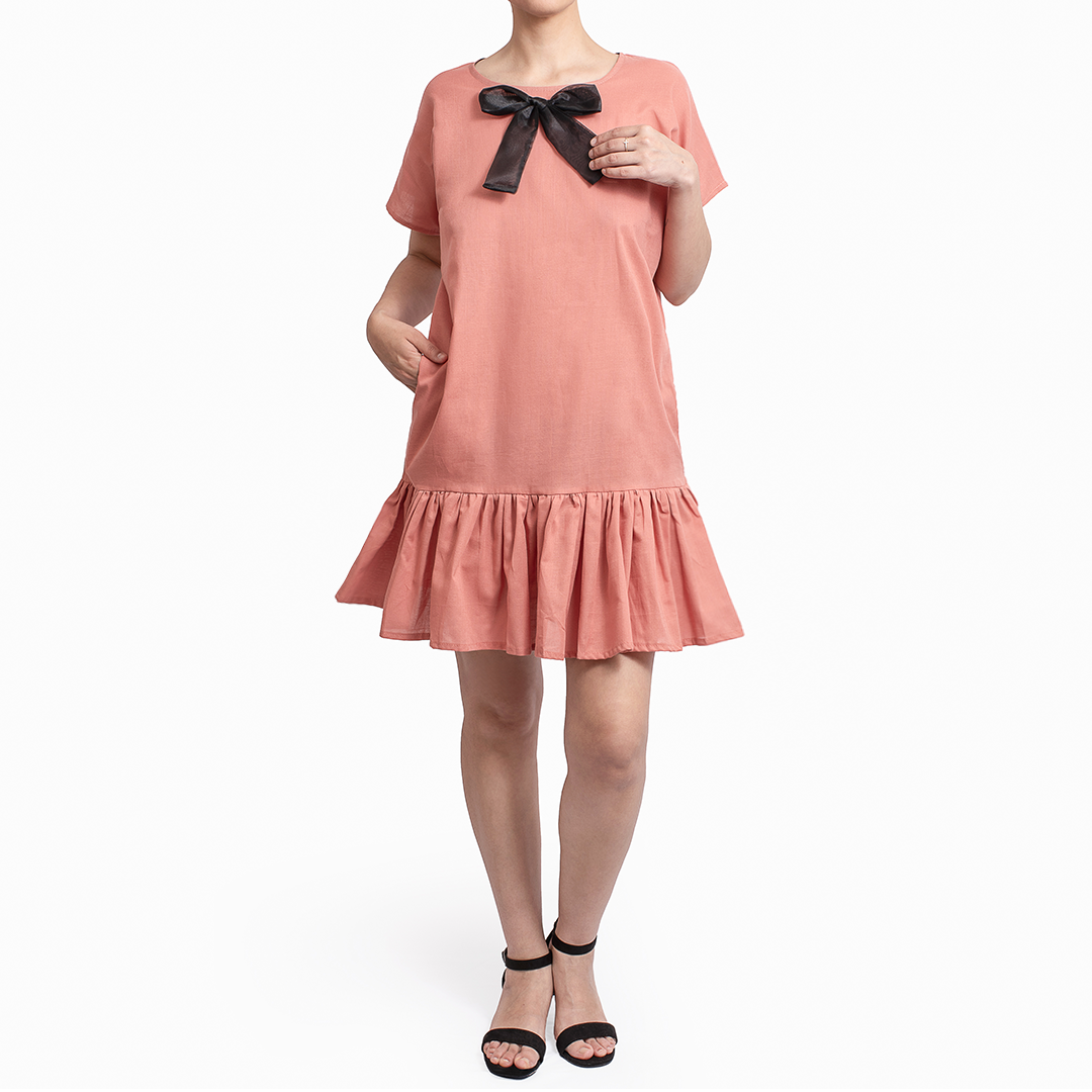 La silueta de corte relajado, combinada con un bajo de volante y el toque distintivo del moño de organza negro, crea un look coqueto y moderno.
